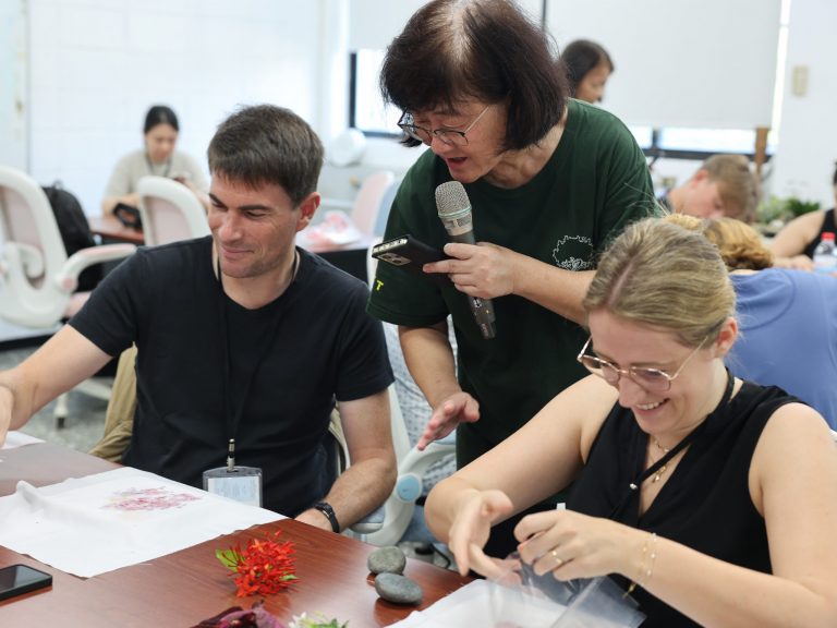訪團交流行程安排與本校通識教育中心主任簡赫琳教授座談,內容涵蓋台灣政治制度、國際關係及民主發展歷程,現場互動熱烈,學員踴躍提問與老師交流觀點。隨後參訪景觀暨遊憩管理研究所,由所長周宛俞副教授介紹台灣在綠色農業、永續環境與綠色照護的實踐案例,並引導分組討論。學員們比較台、德兩國在農業政策與環境管理之差異,提出結合藝術推廣環境教育的構想,以小組形式上台發表討論成果,呈現學習心得與觀察視角;同時在療癒庭園進行實務體驗,透過花草採摘與植物染 DIY,親手操作感受自然素材價值。