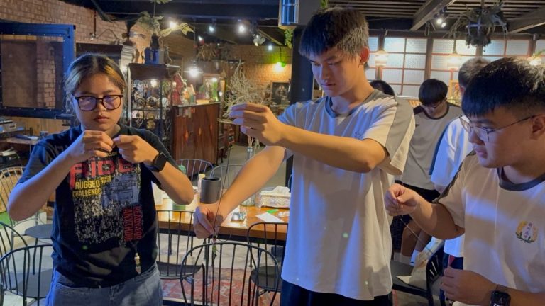 在經歷了一整天的排灣族文化洗禮後,無論是潮州高中學生抑或是本校外籍生,大家都充滿笑容,並感到十分滿足。在製作琉璃珠的過程中,高中生竭盡所能運用外語協助外籍學生實作琉璃珠,透過原民文化的認識與分享,看見學生們打破語言的隔閡,藉由藝術,拉近彼此的距離!